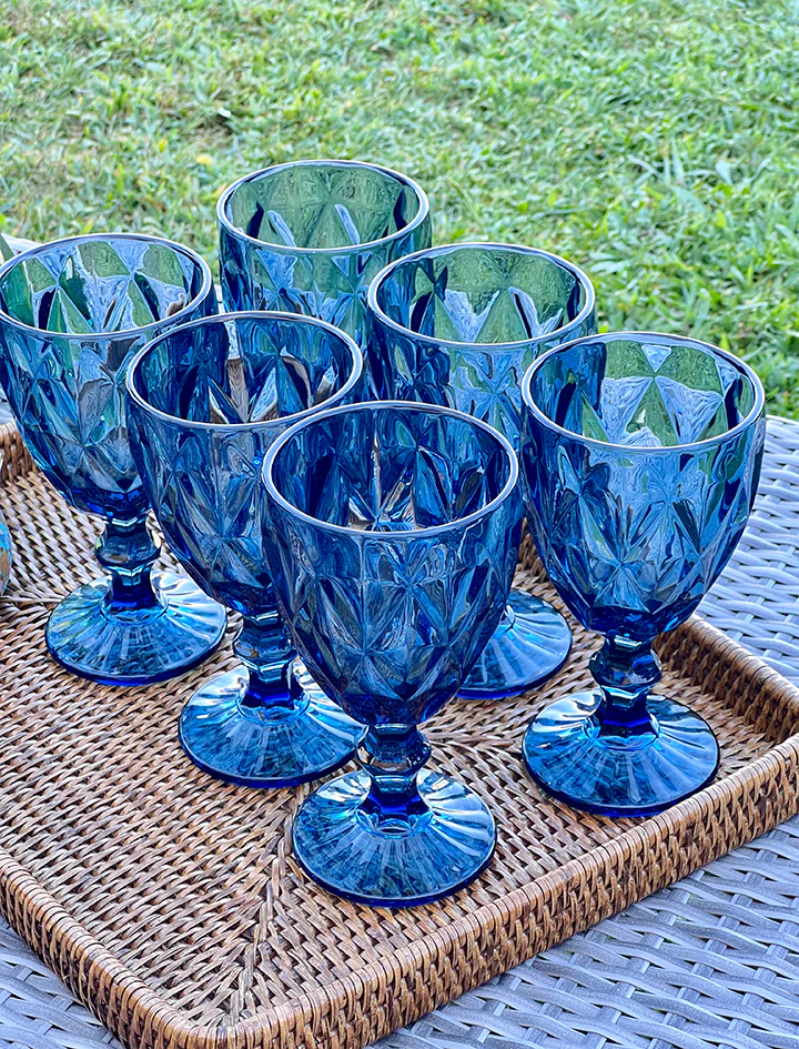 Set de 6 copas aguamarinas de cristal es perfecto para vestir tu mesa con personalidad y sofisticación. Su precioso tono azul intenso aporta un toque de elegancia que transforma cualquier comida en un momento especial. Fabricadas en cristal con relieve decorativo, estas copas no solo son bonitas, también tienen presencia y estilo.