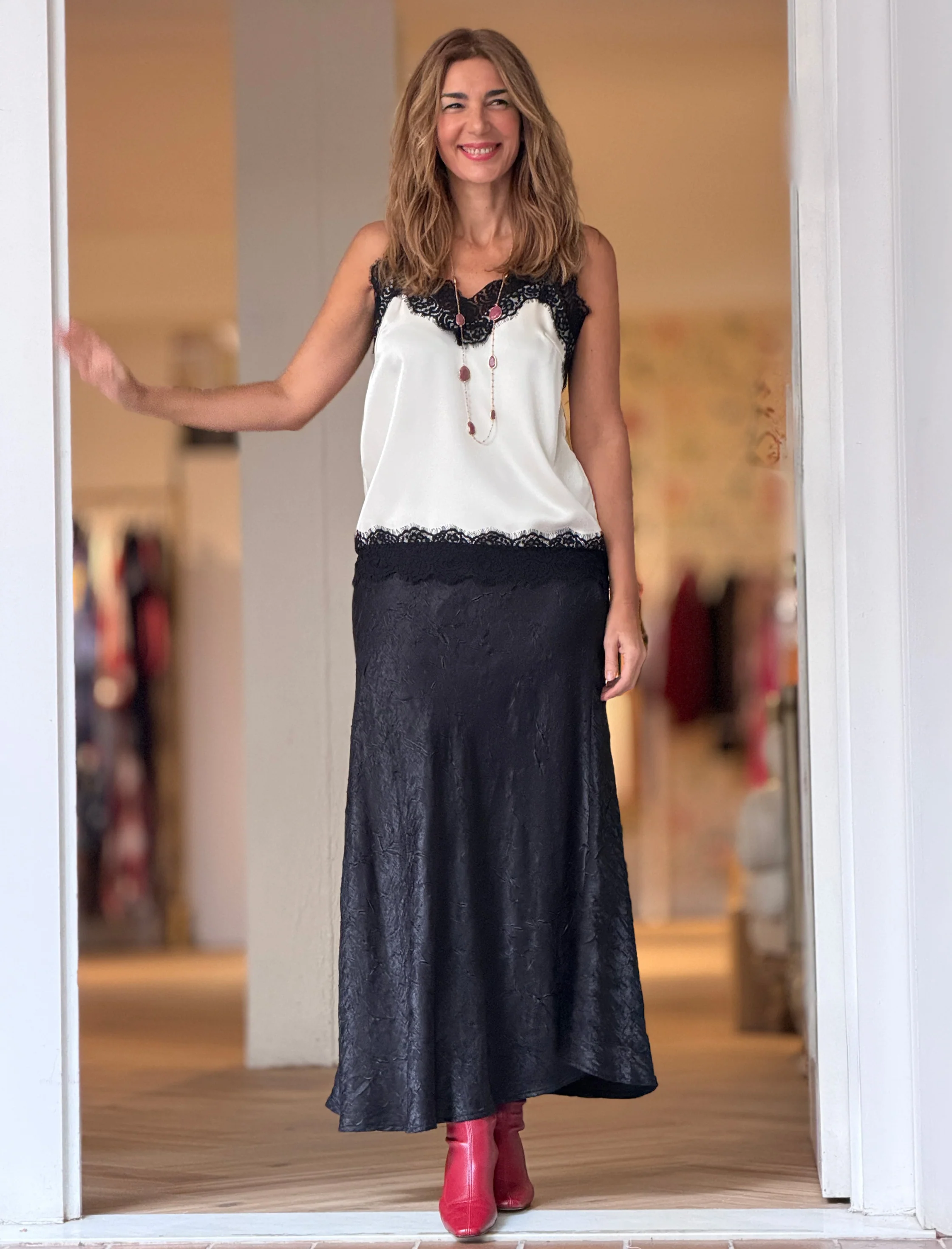 La Falda Evasé Fondo Chic Negra está confeccionada en un tejido elástico de excelente caída, esta falda de corte evasé ofrece una silueta favorecedora con libertad de movimiento inigualable. Es la opción perfecta para crear looks elegantes y chic, adaptándose a cualquier ocasión con un toque sofisticado.