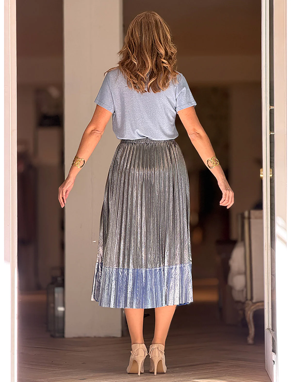 Falda Tablas lurex chic índigo es pura elegancia con un toque moderno. Su diseño de tablas finas estiliza la silueta y aporta movimiento al caminar. El tejido con efecto brillo metalizado le da ese punto especial que ilumina el look. Ideal para eventos, cenas, celebraciones. Combínala con unos zapatos de salón y te quedará un lookazo.
