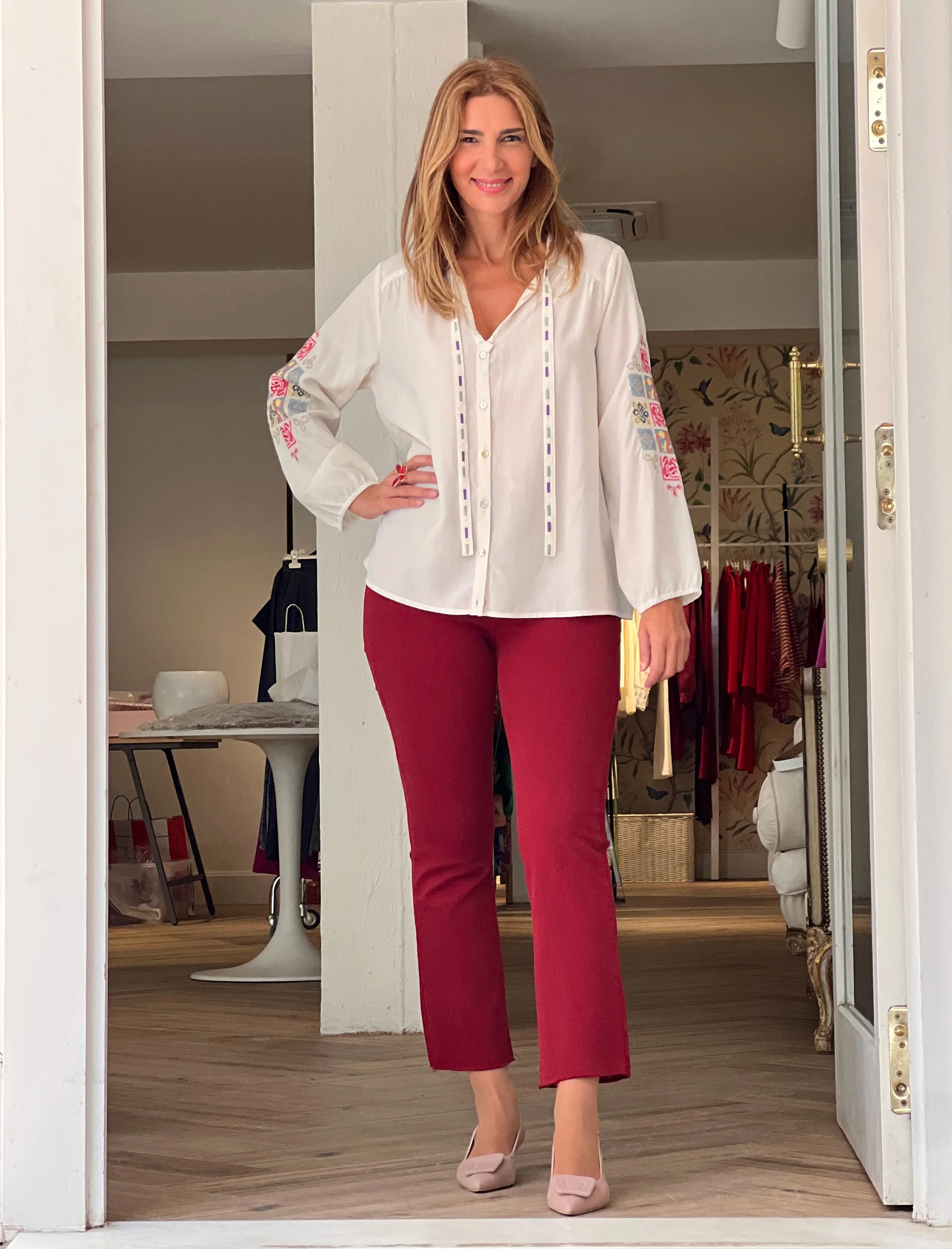 Los jeans flare burgundy combinan la comodidad del tejido elástico con el estilo atemporal del corte de campana. Se adaptan a la silueta sin perder su forma y su color burgundy aporta un toque de sofisticación y originalidad, perfecto para destacar en cualquier look, ya sea con blusas, camisetas básicas o camisas elegantes.