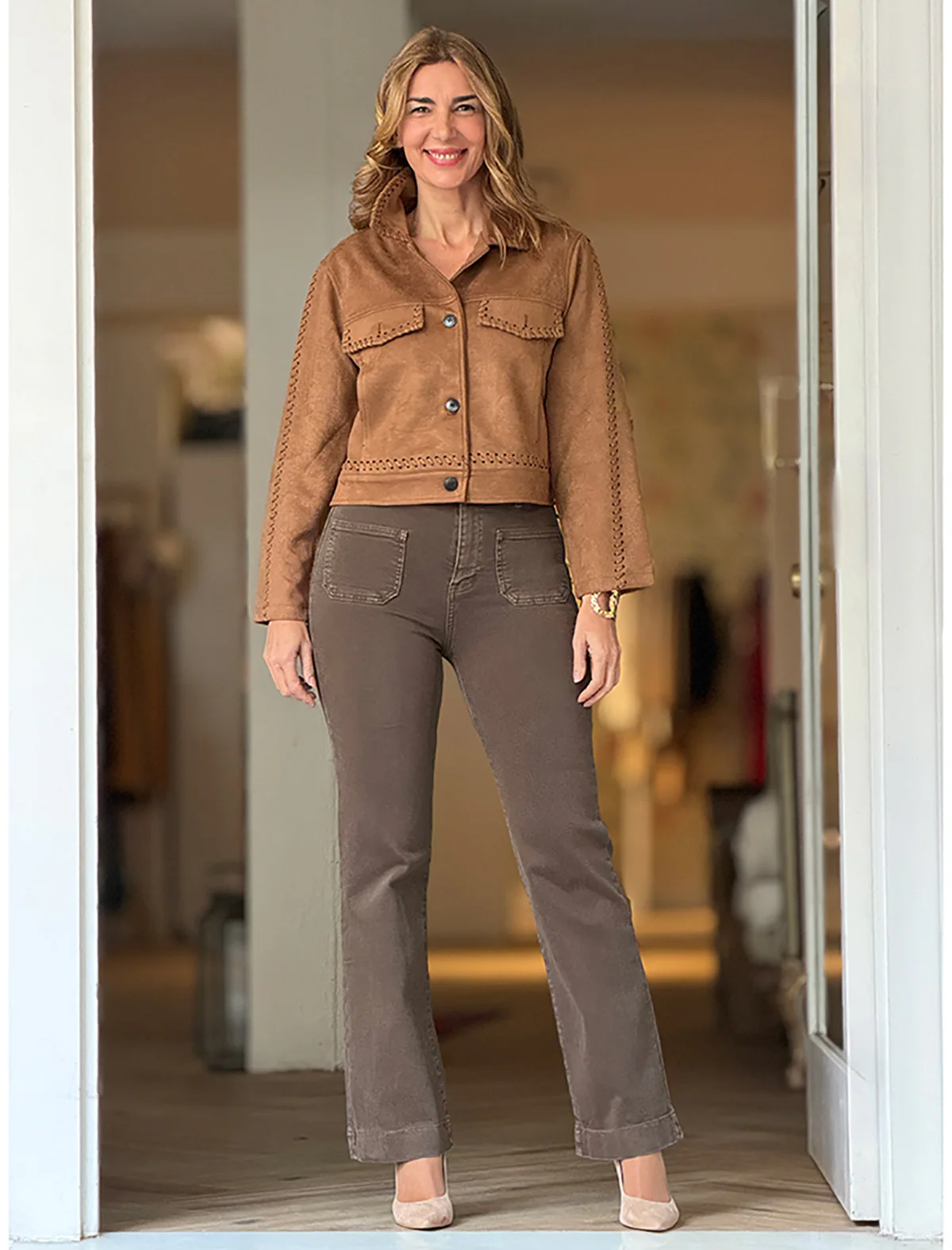El pantalón vaquero camel visón es una de esas prendas que elevan cualquier look con muy poco. El talle alto recoge y estiliza la figura, alargando visualmente la pierna. El diseño incluye bolsillos frontales , que le dan un toque moderno, y un corte recto que sienta bien a todas las siluetas. Es un pantalón muy combinable: queda ideal con camisas fluidas, punto suave o chaquetas estructuradas.